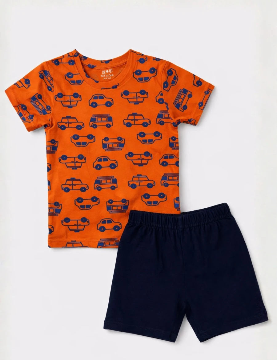 Orange Navy Cars Contrast Shorts Set (Unisex)